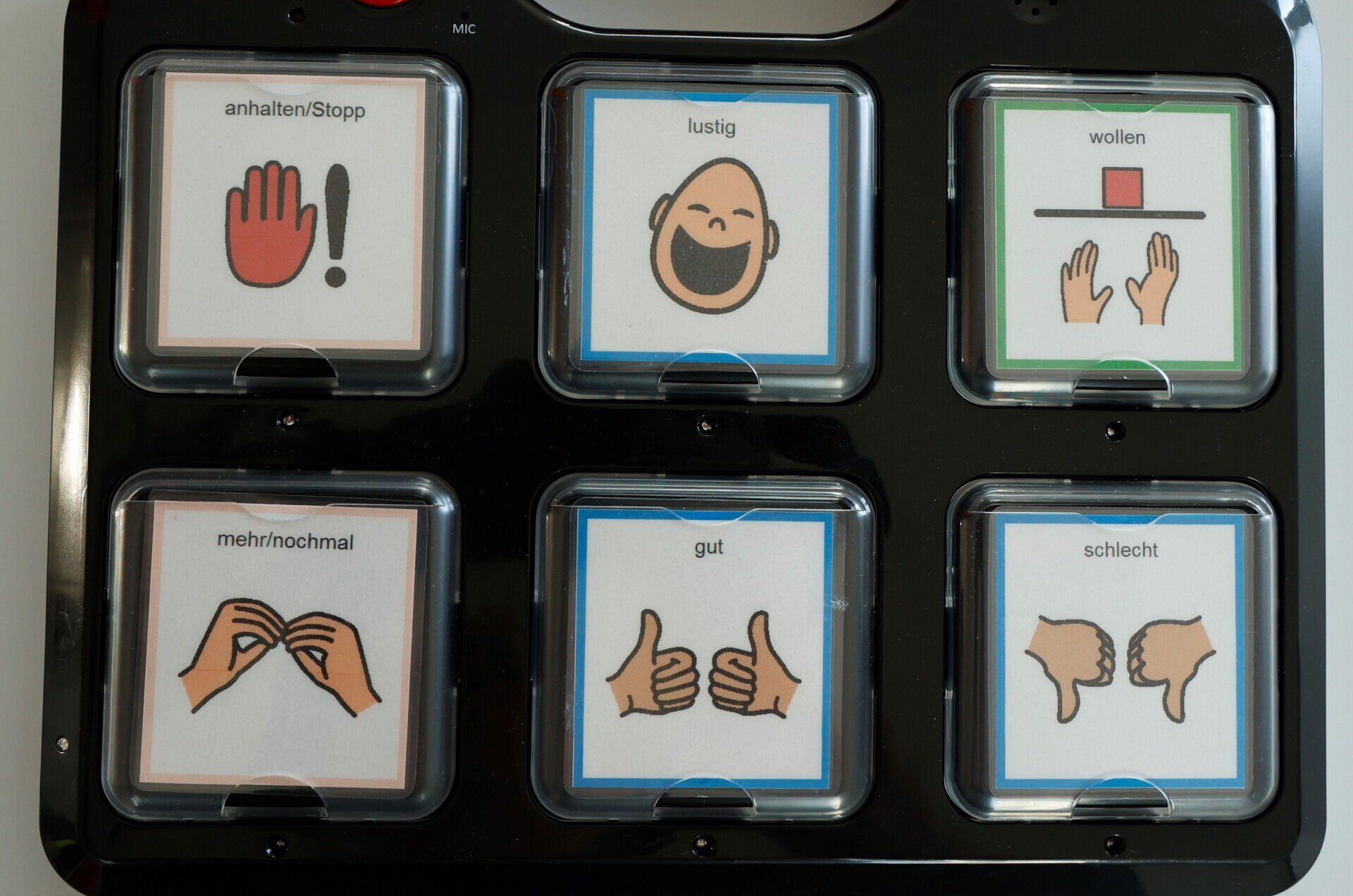 - Komplexe Sprechhilfen mit statischem Display (z. B. Go-Talk, Supertalker, Chatbox)